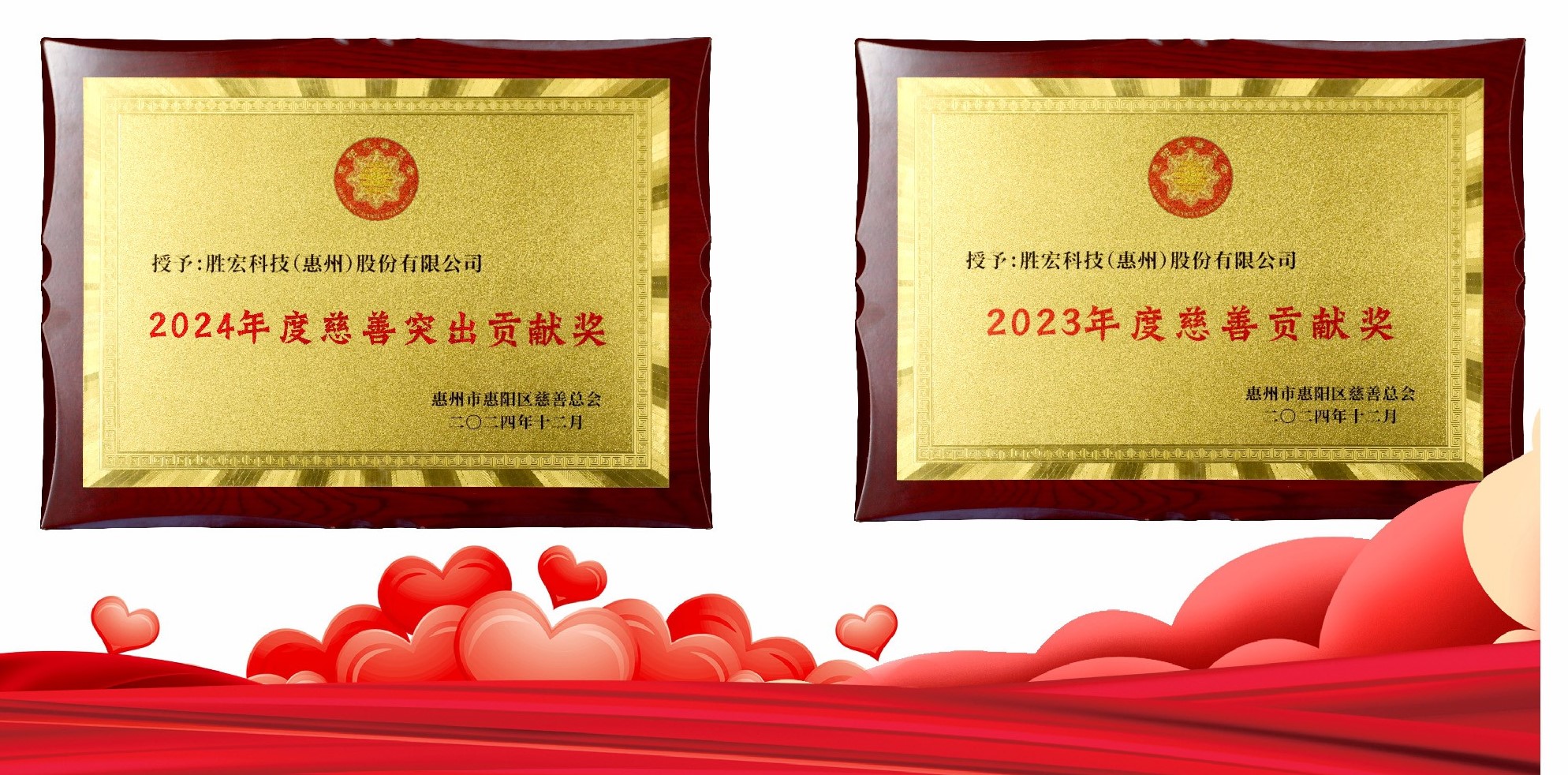 会上,惠阳区慈善总会表彰了2023年度和2024年度在慈善事业发展中作出积极贡献的33家爱心企业和社会组织。其中,公司荣获2024年度“慈善突出贡献奖”和2023年度“慈善贡献奖”。此次获奖不仅是对我司在慈善领域所做努力的认可,也是对我司高度的社会责任感和崇高的公益精神的肯定。