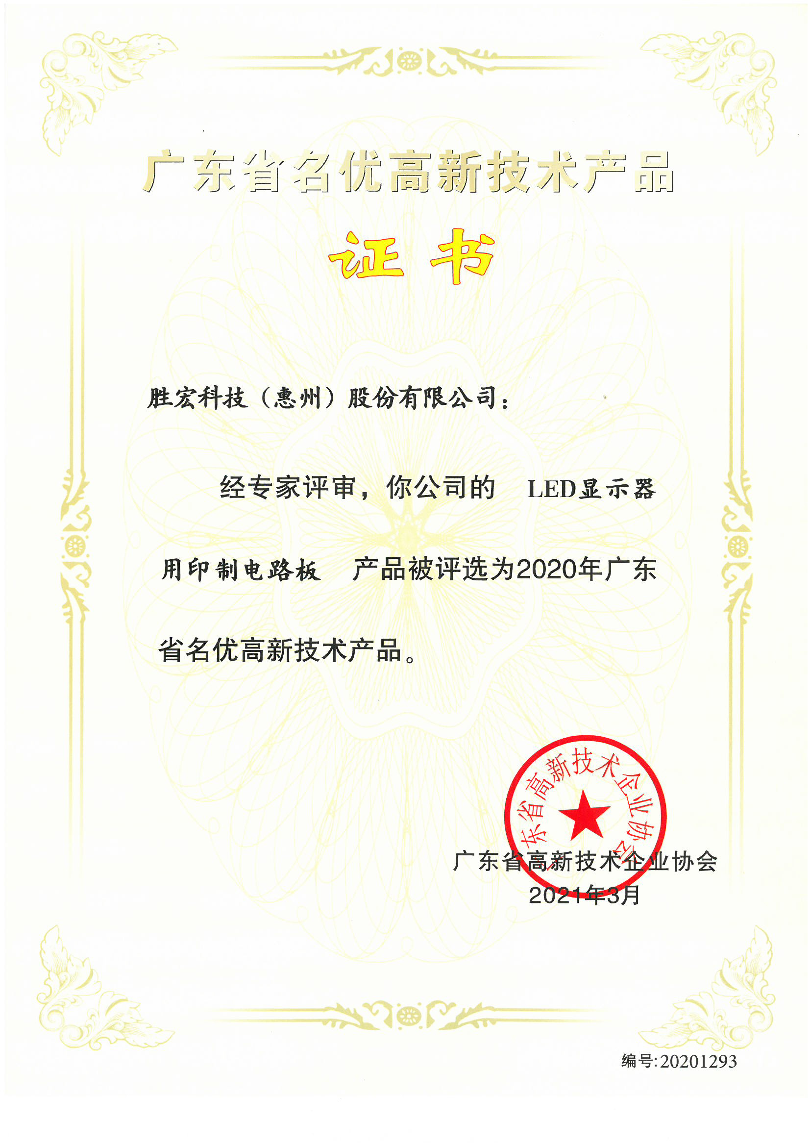 “LED显示器用电路板”名优高新技术产品证书